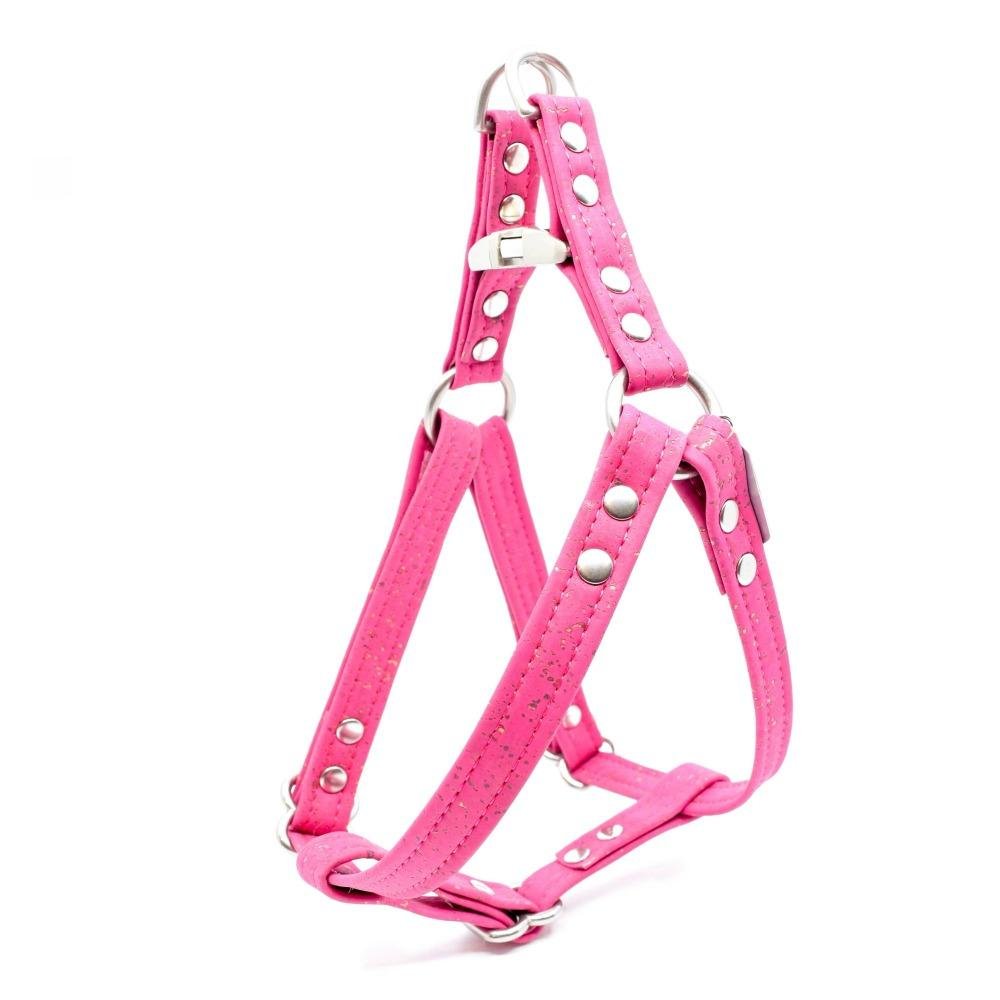 Our Fuchsia Cork Dog Harness is where eco-luxe style, comfort and support all come together. The simple design provides a more supportive option for dogs who walk with purpose. Handcrafted in our Connecticut studio with bright pink, cork leather, a soft, leather alternative with unique, subtle variations in color and texture.Â